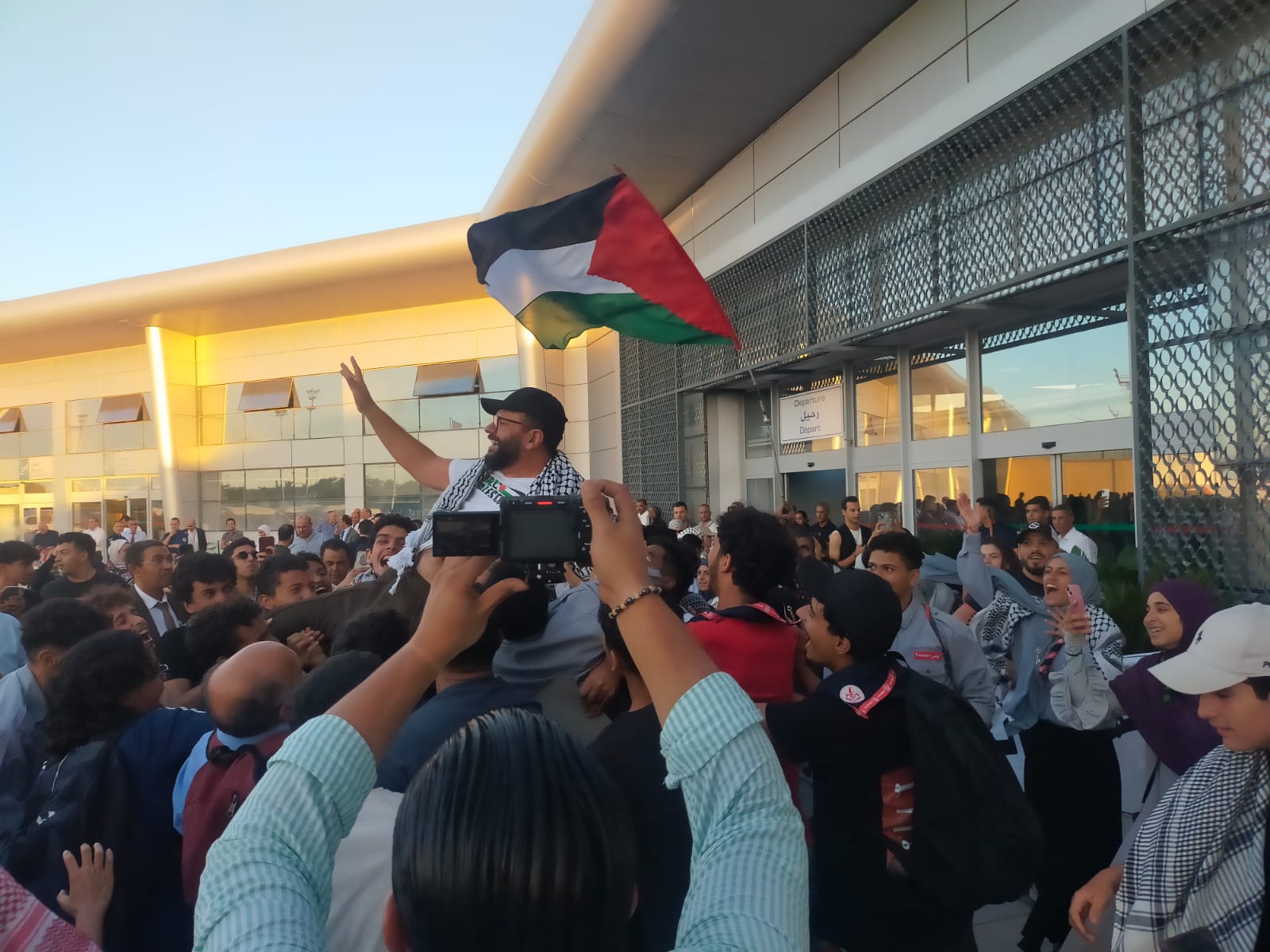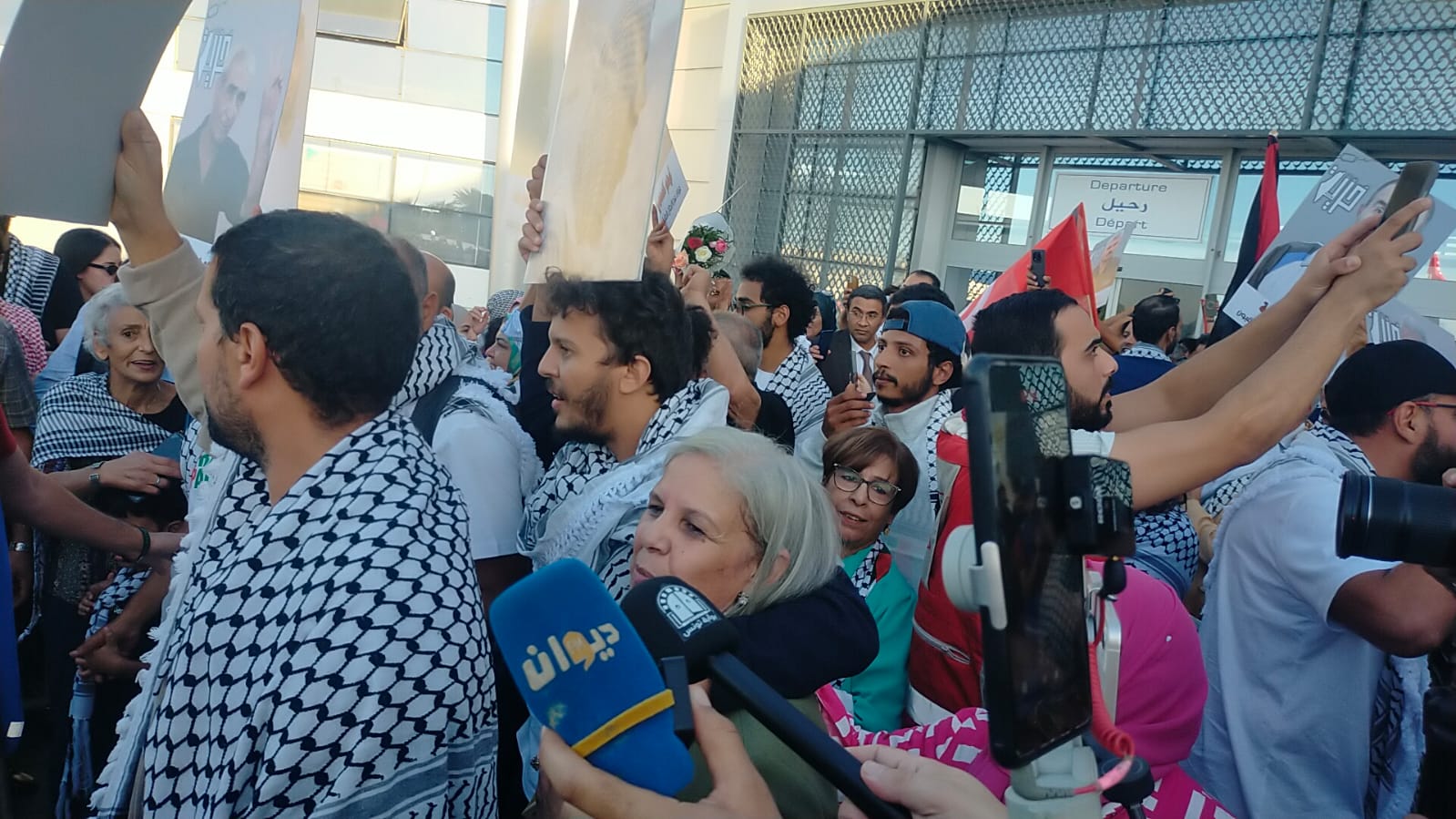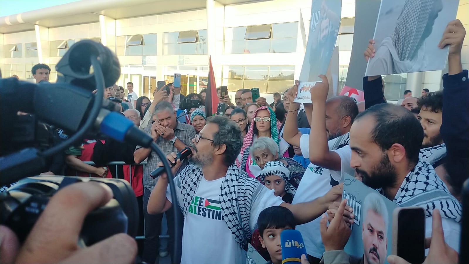 Upon their arrival, they were received by hundreds of citizens, relatives, activists, and members of civil society, who came to express their solidarity and pride in an atmosphere marked by emotion, singing, Tunisian and Palestinian flags, and slogans in favor of freedom for Gaza and justice for Palestine.